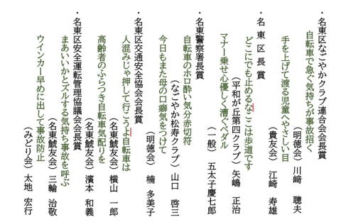 ●第50回名東福祉大学校教養講座 ●東海北陸ブロック老人クラブリーダー研修会 ●女性委員会・女性リーダー代表者会合同会議 ●令和7年度第2回区な連女性代表者会 ●第50回名東福祉大学校教養講座 ●令和7年度 高齢者交通安全総決起大会・川柳大会 ●第17回高齢者交通安全川柳大会 入選作品